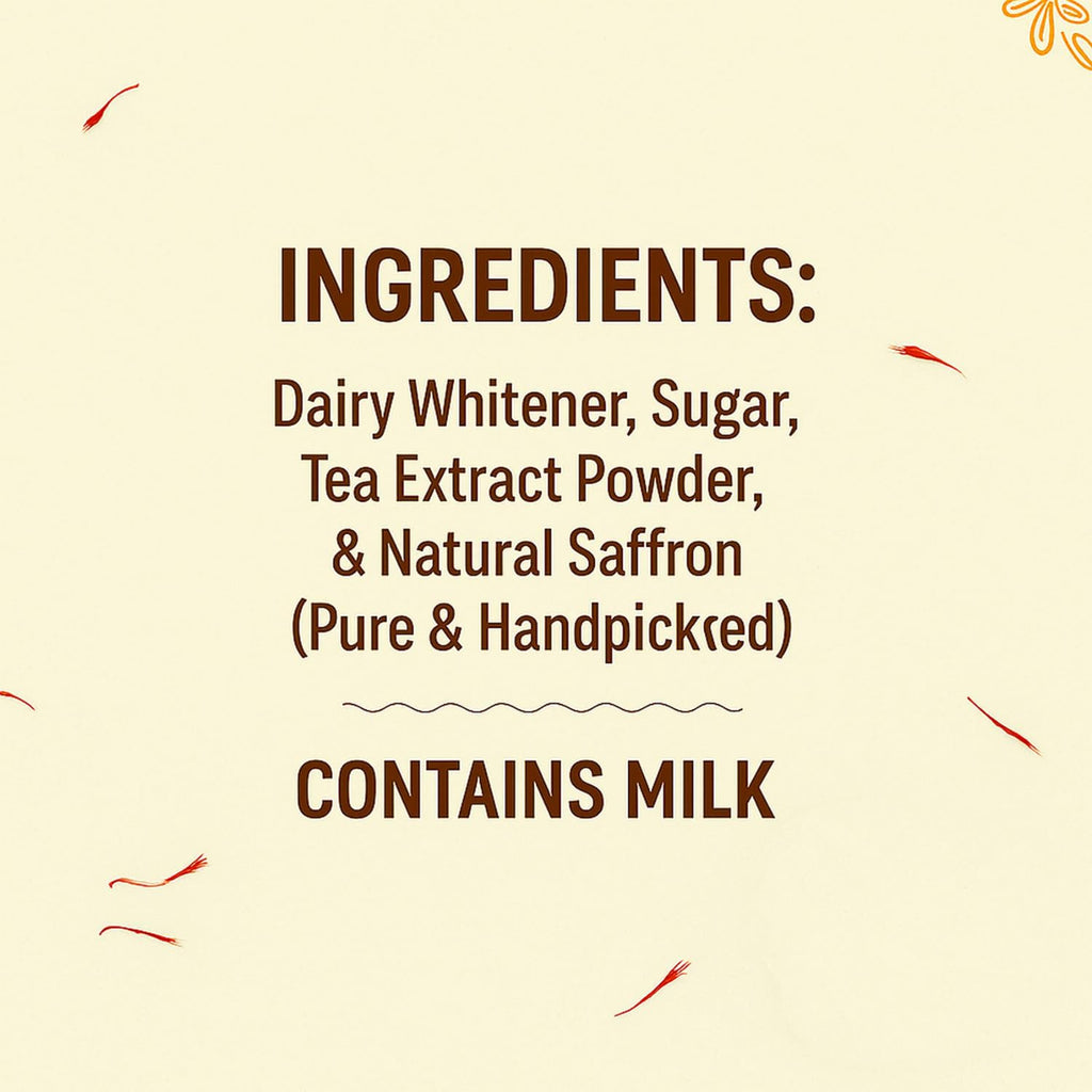 Ingredients: Dairy Whitener, Sugar, Tea Extract Powder, & Natural Saffron (Pure & Handpicked) CONTAINS MILK