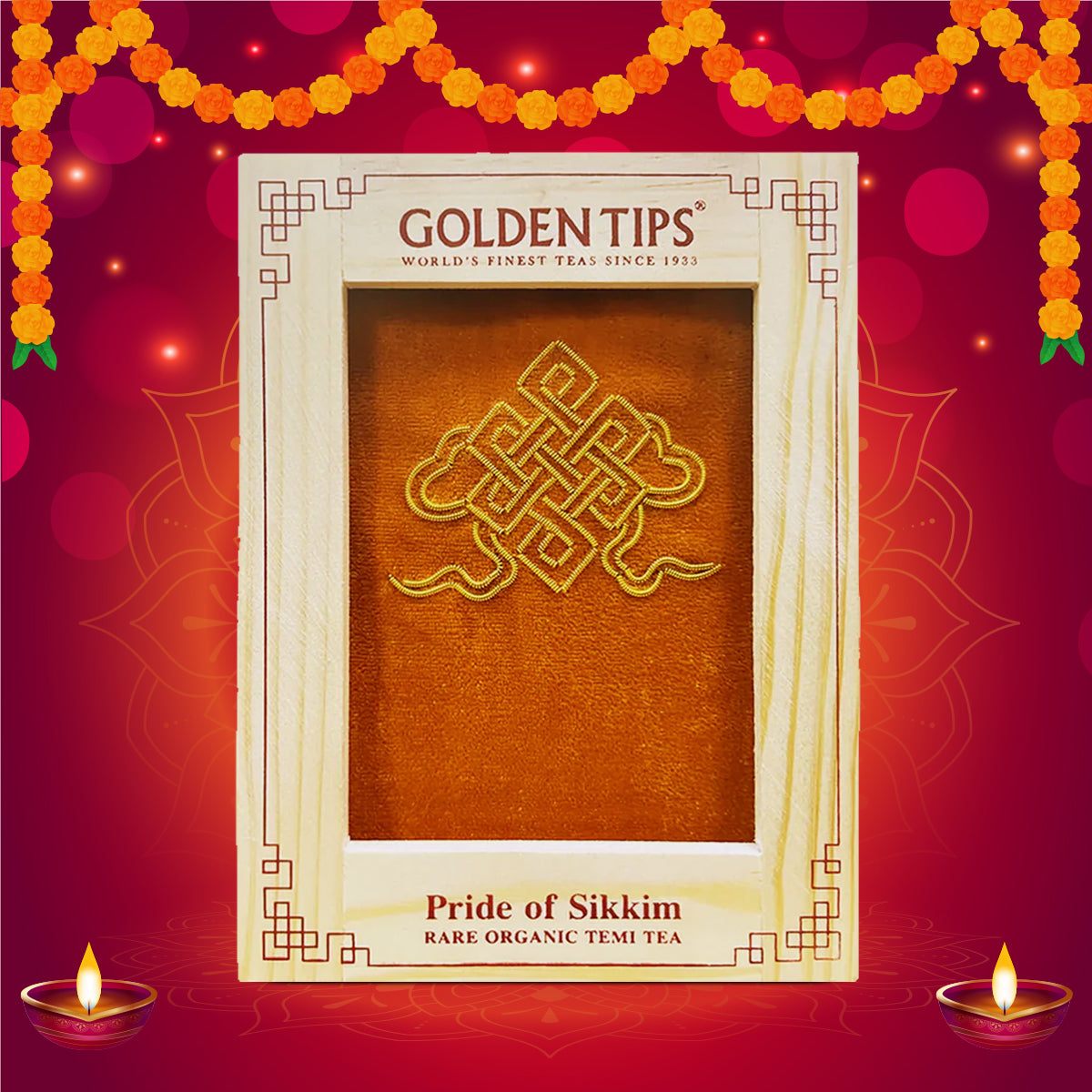 An outstanding & rare Second Flush Sikkim Tea meant for connoisseurs of Golden Tips Teas across the globe. Originating from the Temi Tea Estate which produces one of the finest teas in the world, this selection with a unique and typical flavor, is packed in an elegant velvet bag adorned by the knot to Eternity, articulately hand-embroidered in the golden thread (zari) in the zarodi form of craftsmanship and placed into a window-lid pinewood box.